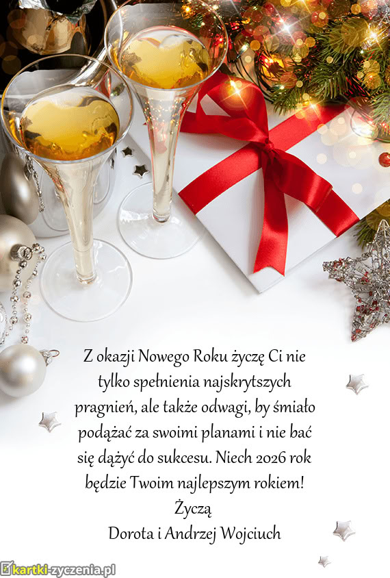 Z okazji Nowego Roku życzę Ci nie tylko spełnienia najskrytszych pragnień, ale także odwagi, by śmiało podążać za swoimi planami i nie bać się dążyć do sukcesu. Niech 2026 rok będzie Twoim najlepszym rokiem!